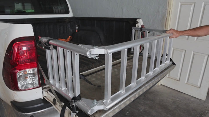 Ingenious Dual-Purpose: Not only is this a highly functional motorcycle ramp, but its unique folding mechanism allows it to act as a tail cover for your bakkie (pickup truck), offering practical utility when not in use.